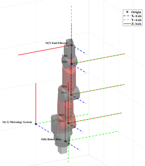 Think of a 3D graph like the one in the figure above. You have an x axis, a y axis, and a z axis. Anywhere you go in space can be defined by some combination of your x position, your y position, and your z position (i.e. your coordinates). To make it extra complicated (and extra useful) however, we also care about how your coordinate frame (i.e. the direction your axes are pointing in) is rotated around those three axes relative to the rest of the world! For example, look at the robot arm below. At each joint there is a coordinate frame that describes the pose of that joint relative to everything else. That coordinate frame at the bottom off in space is our world frame. The rest of the frames are defined relative to that. Some of them are simply translations (changes in position) relative to each other, some are simply rotations (changes in orientation) and some are both translations AND rotations (to visualize the rotations look at the directions the colors are pointing, each color represents a different axis).